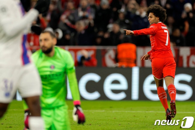 拜仁慕尼黑队的塞尔日·格纳布里在与巴黎圣日耳曼队的比赛中攻入一球。