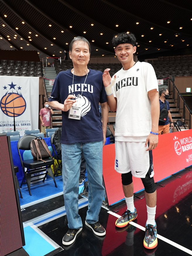 张镇衙和政大雄鹰男篮队创办人姜丰年合照。世界大学篮球赛外籍生莫巴耶轰30分政大收下胜利